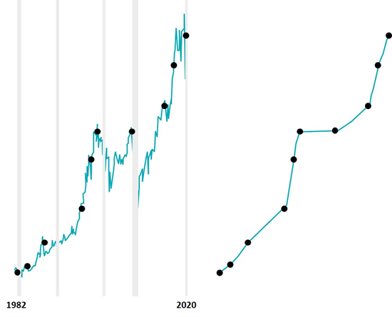 And, if you’re a visual learner – the chart below presents the course of the market from 1982 to 2020 but removes the drops. You’ll see that progress has been made.